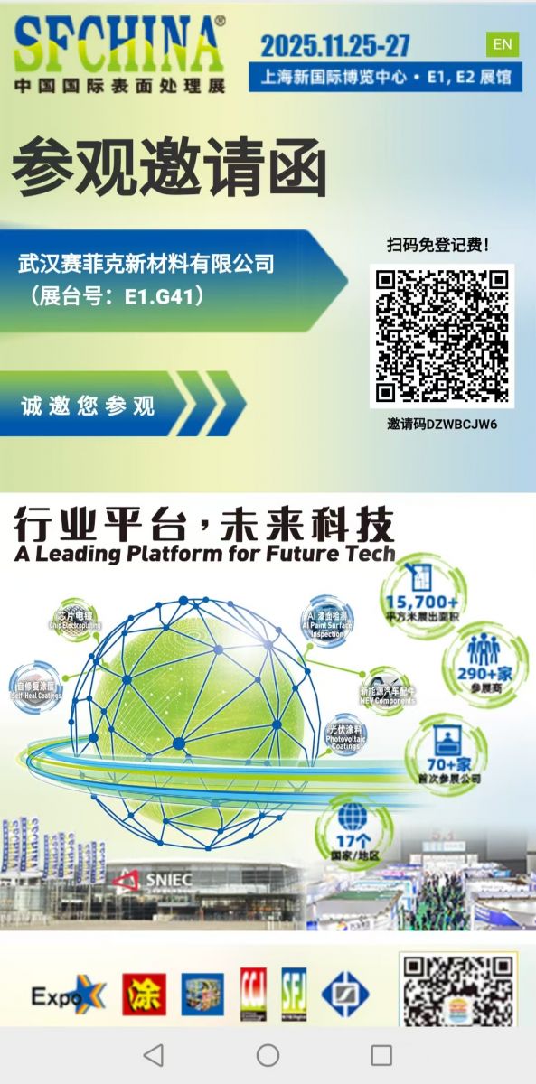 赛菲克希望在全球化的金属表面处理市场上,引领表面化学创新,恳请广大新老客户莅临展会现场交流指导,扫码免登记费,邀请码:DZWBCJW6